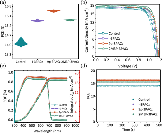 (a) 器件(基于 I-3PACz 的 PSC、基于 9p-3PACz 的 PSC、基于 2M3P-3PACz 的 PSC 和基于 PTTA 的 PSC)的 PCE 统计分布图。