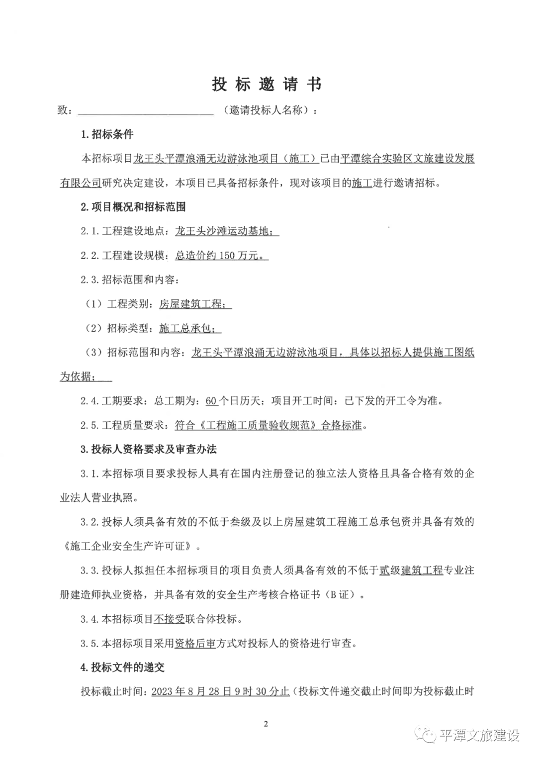 投标邀请书【龙王头平潭浪涌无边游泳池项目(施工)】