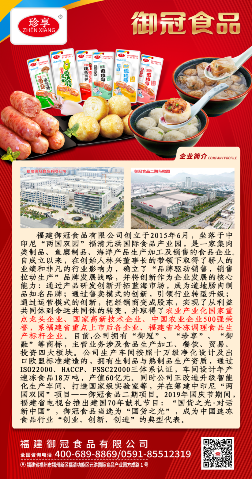 除此之外,御冠所有产品还遵循烹饪便捷、高效、多样的特点,道地肠、爆蛋等产品可烤、可油炸、可空气炸锅、可微波、可蒸、可煮、可炒···怎么做都好吃,满足了大众消费者的多样化需求。不仅如此,御冠还可根据客户对产品的特殊要求进行专业化定制加工。同时,御冠还在全国搭建了冷链物流配送系统,产品远销全国30多个省、市、自治区,涵盖中国香港、中国澳门,涉及印尼、越南、老挝、泰国等东南亚地区。并凭借一系列的产品优势,御冠食品成为众多商超便利连锁系统的首选产品,成功入驻永辉、沃尔玛、永旺、胖东来、711、罗森、美宜佳、浙江十足、南昌乐豆家、湖南新佳宜、青岛友客、西安唐久、安徽邻几、厦门见福、福州万嘉等国内知名连锁便利品牌,销路广阔,备受信赖。