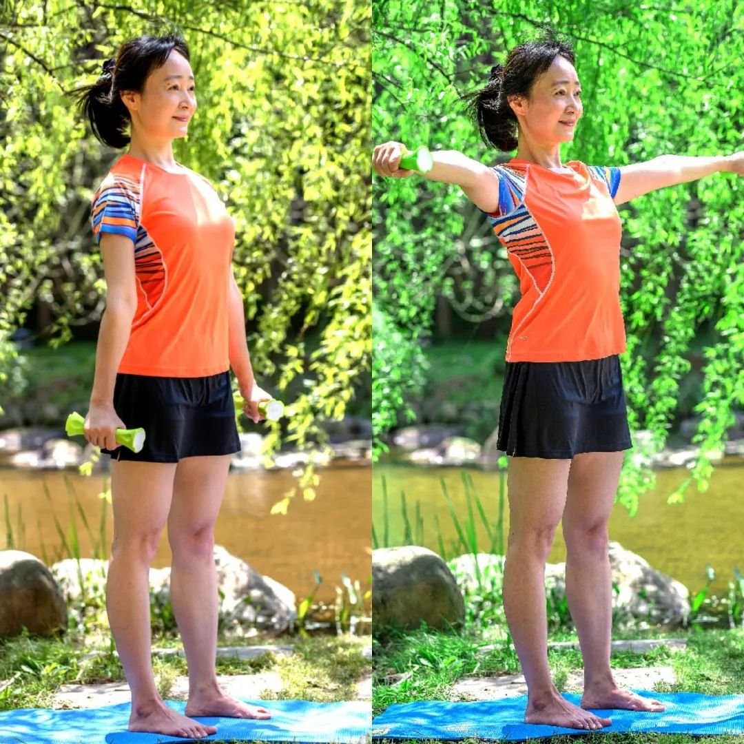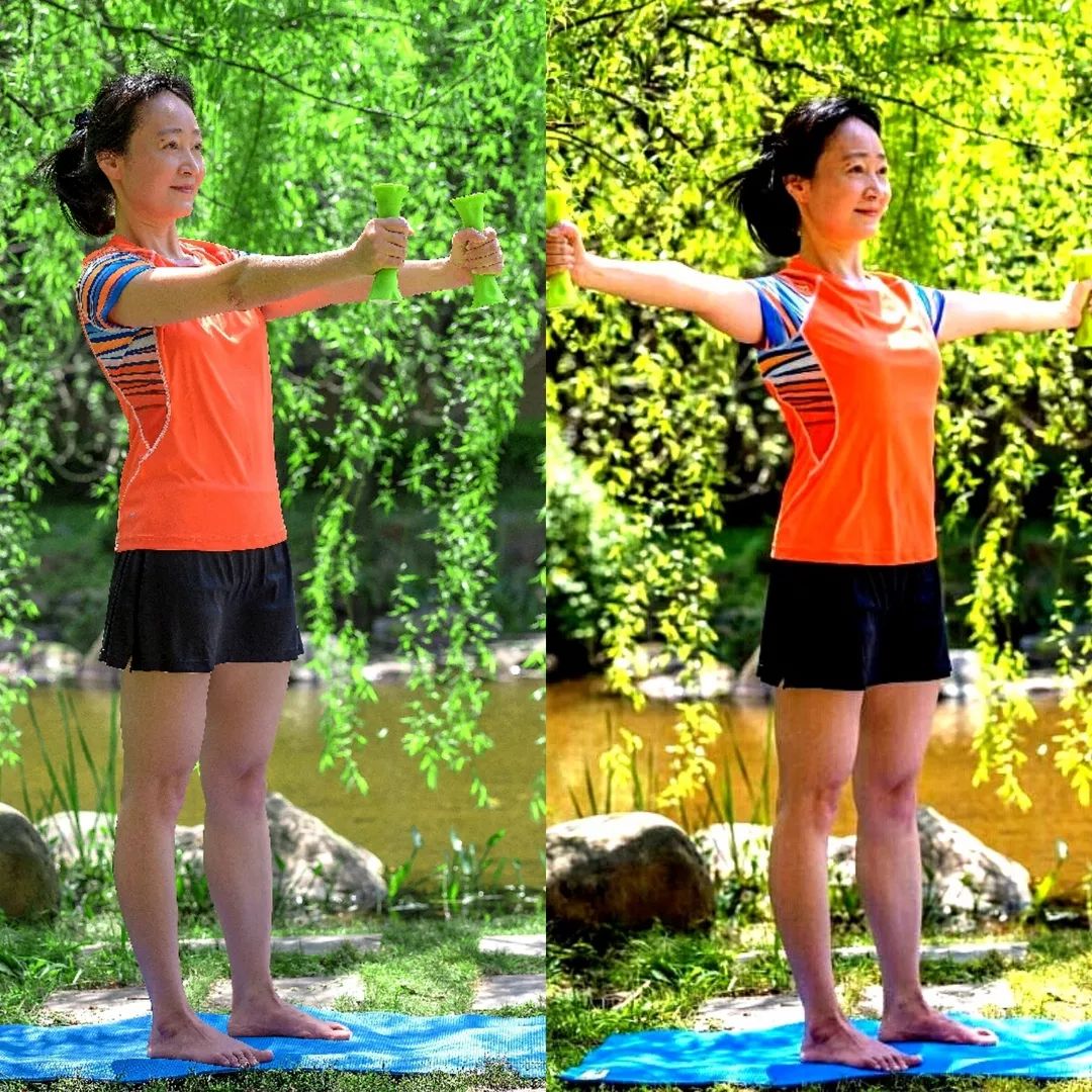 下扣双腕、屈双肘,沿体侧上抬举至平肩,保持动作不变形的情况下,慢慢恢复到起始。平举时吐气,回落时吸气。