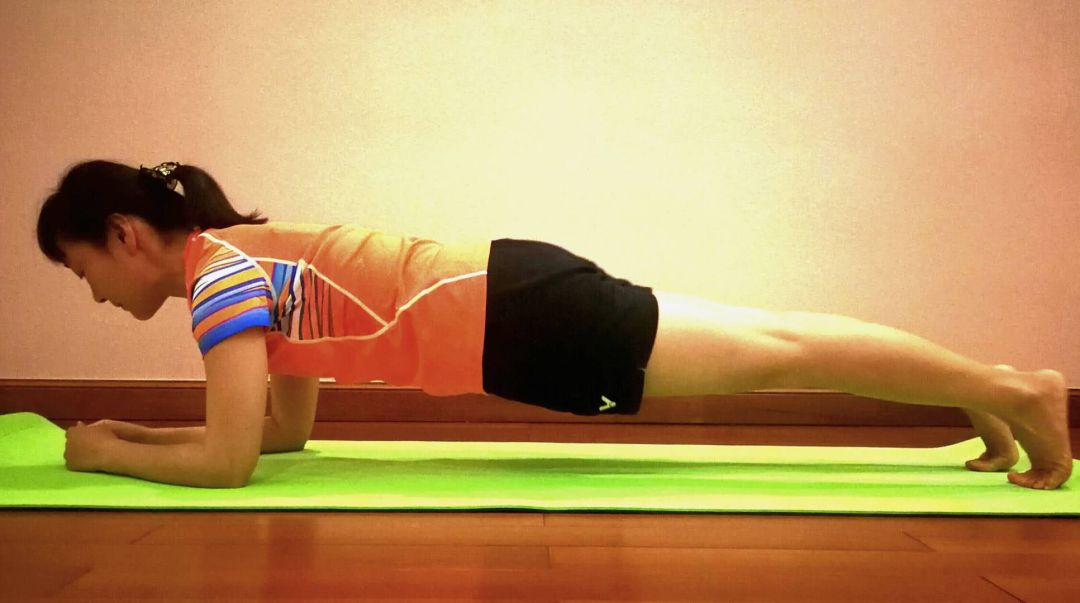 俯卧于垫上,肘关节在肩关节正下方,前臂呈三角形,双手合拢或握拳,用双臂撑起身体,头部、肩部、胯部和踝部保持在同一平面,腹部收紧,保持均匀的呼吸。