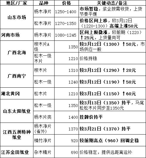 核心观察:3月24日,市场整体呈现 “南涨北稳,松木领涨” 的格局。松木片在南方(广西、湖北)及北方(山东)价格均出现显著上涨,区间上移50-60元,成为最强驱动。桉木片在广西地区继续小幅跟涨。杨木片北方主产区价格区间保持稳定,河南高端略有上探。楠竹净片价格自高点回调后趋于稳定。