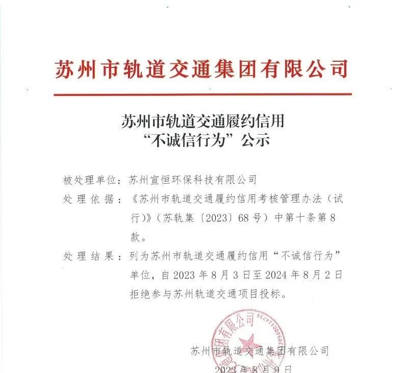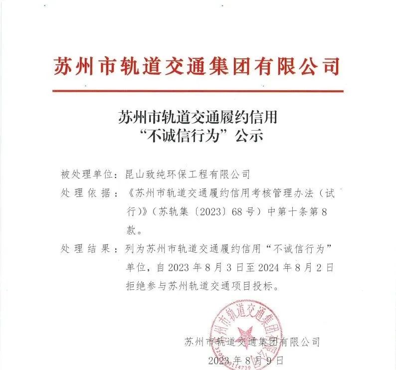 苏州市轨道交通履约信用“不诚信行为”公示