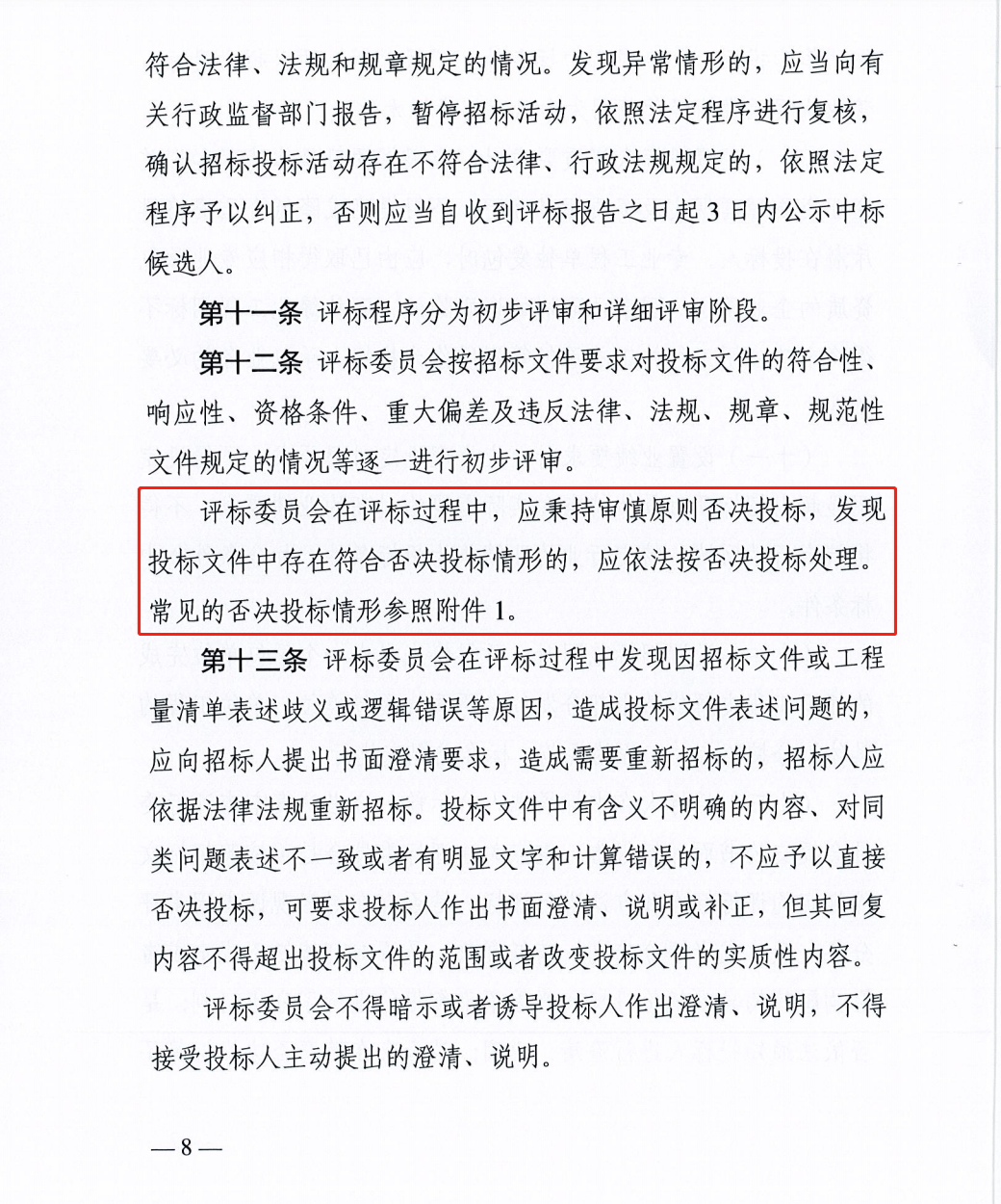 第十二条 评标委员会在评标过程中,应秉持审慎原则否决投标,发现投标文件中存在符合否决投标情形的,应依法按否决投标处理。