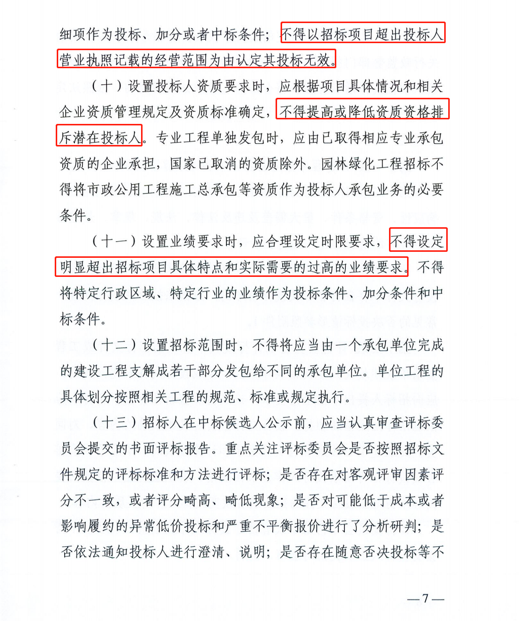 不得限制或者排斥潜在投标人,以及对潜在投标人实行歧视待遇;不得以营业执照记载的经营范围作为确定投标人经营资质资格的依据;不得将投标人营业执照记载的经营范围采用某种特定表述或者明确记载某个特定经营范围细项作为投标、加分或者中标条件;不得以招标项目超出投标人营业执照记载的经营范围为由认定其投标无效。