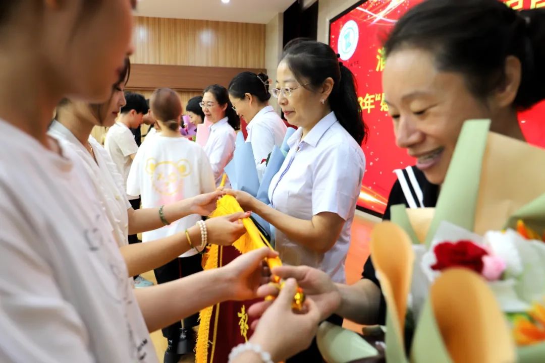颁奖台上毕业生为高三各任课教师行谢师礼,行感恩礼,献花并送上锦旗,以此感谢各位老师三年如一日的精心培育,用知识浇灌学生,用激励督促自己,最后怀着感恩之心与老师热切相拥。
