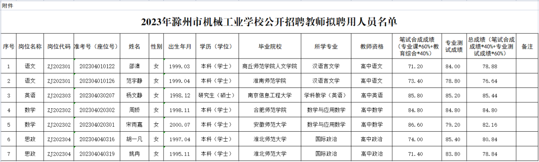 根据《2023年滁州市机械工业学校公开招聘教师公告》及相关规定,经过报名资格审查、笔试、资格复审、专业测试、体检考察等程序,确定邵澳等7人为拟聘用人员,现予以公示(名单见附件)。