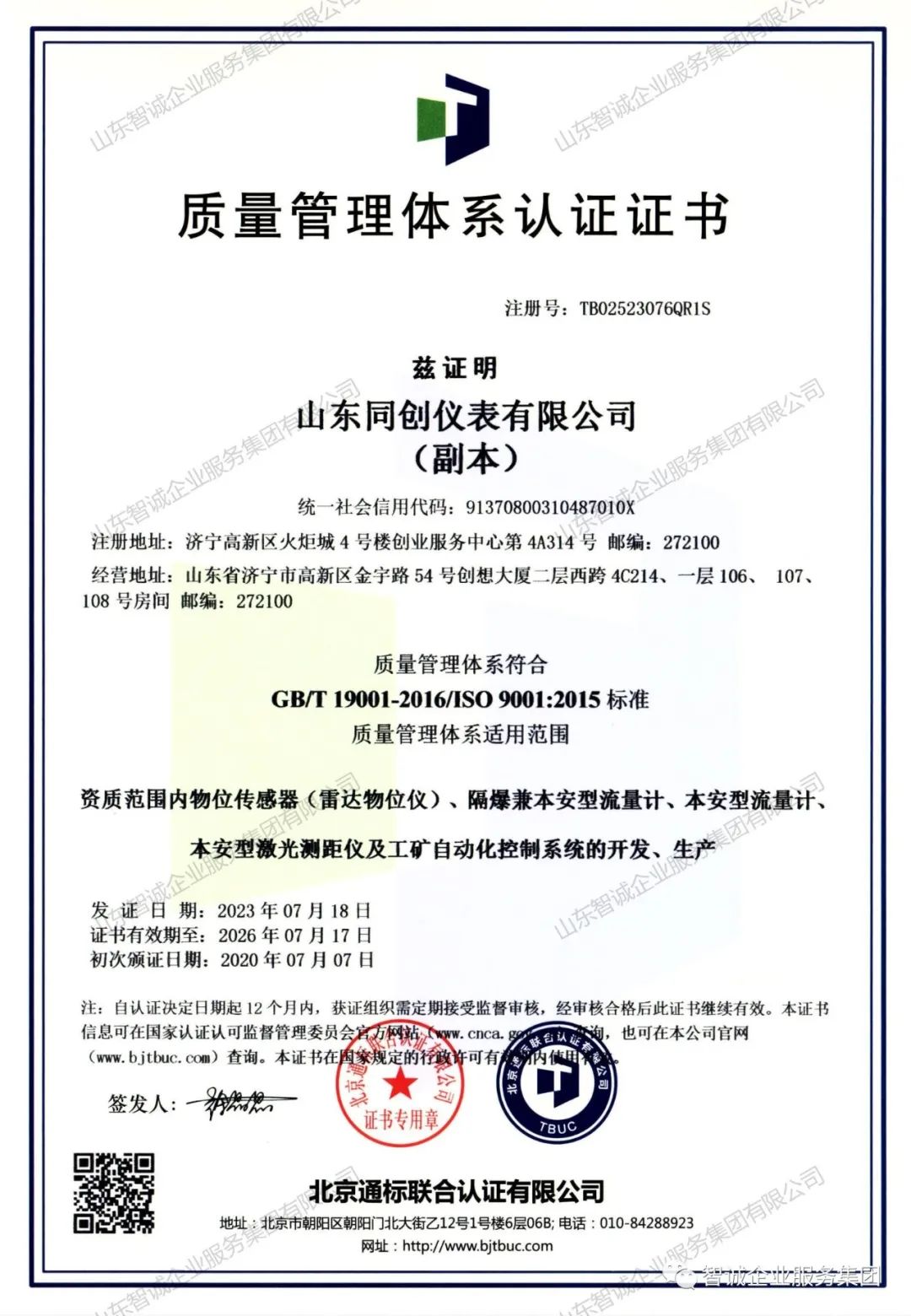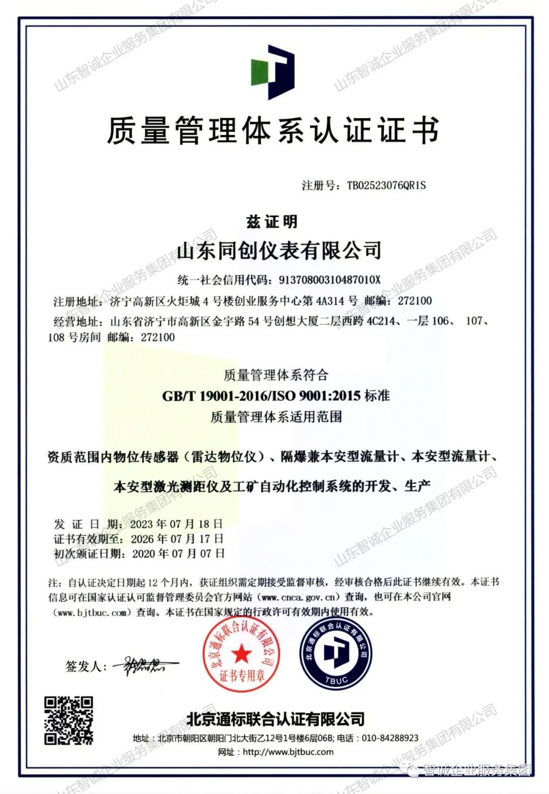 山东同创仪表有限公司通过国家认监委备案机构的ISO9001质量管理体系认证审核