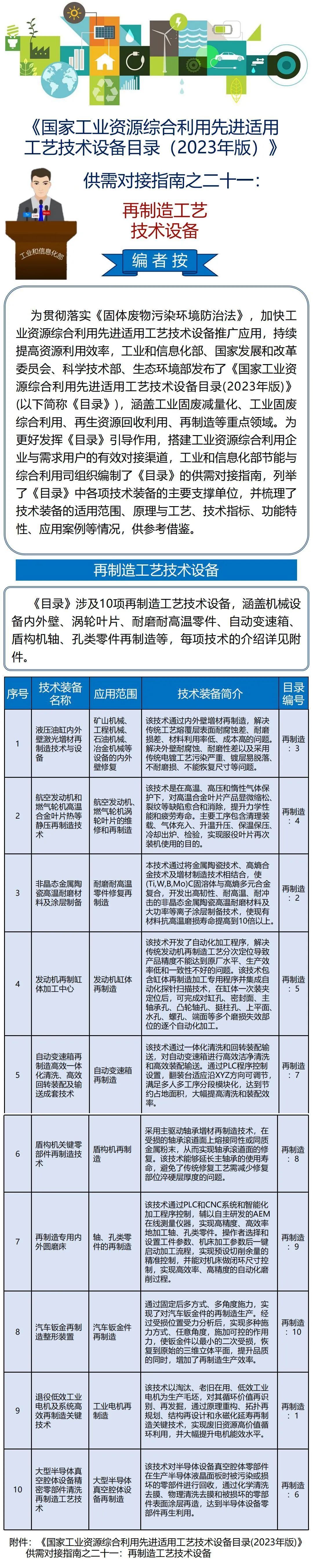 国家工业资源综合利用先进适用工艺技术设备目录(2023年版)供需对接指南之二十一:再制造工艺技术设备