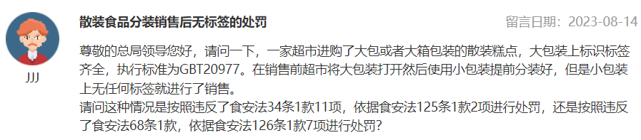 尊敬的总局领导您好,请问一下,一家超市进购了大包或者大箱包装的散装糕点,大包装上标识标签齐全,执行标准为GBT20977。在销售前超市将大包装打开然后使用小包装提前分装好,但是小包装上无任何标签就进行了销售。