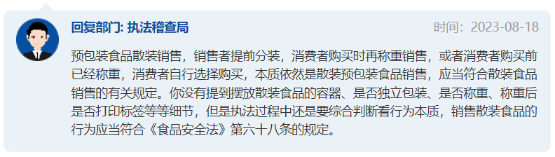 预包装食品散装销售,销售者提前分装,消费者购买时再称重销售,或者消费者购买前已经称重,消费者自行选择购买,本质依然是散装预包装食品销售,应当符合散装食品销售的有关规定。你没有提到摆放散装食品的容器、是否独立包装、是否称重、称重后是否打印标签等等细节,但是执法过程中还是要综合判断看行为本质,销售散装食品的行为应当符合《食品安全法》第六十八条的规定。