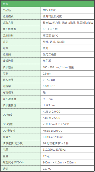 该微孔板分光光度计可为6 – 384 孔板和比色皿一起使用, 在200 - 999nm范围内的波长可任意选择,支持终点、动力学和光谱扫描等多种检测模式,温度控制高达65°C,具有多种振荡方式,是多用户使用环境的理想选择。具体参数如下图所示。