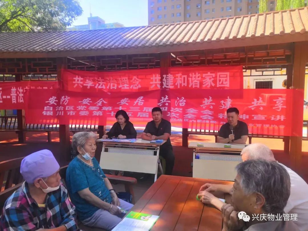 为深入贯彻落实自治区党委十三届四次全会、银川市委第十五届八次全会精神,8月23日上午,兴庆区物业协会联合兴庆区人民法院,走进唐徕小区,开展了以“安防 安全 安居 共治 共建 共享”为主题的自治区党委十三届四次全会暨银川市委第十五届八次全会精神宣讲活动。 在宣讲过程中,兴庆区物业服务中心负责人李景博向小区居民宣讲自治区党委十三届四次全会暨银川市委第十五届八次全会精神,强调居民燃气安全、消防安全、用电安全、出行安全等方面注意事项,号召居民有“时时放心不下”的清醒、责任和自觉,坚决杜绝在小区私拉电线充电、占用消防通道、乱堆乱放等行为,同时做好小区安全生产“监督员”和“劝导员”,把危险发现在萌芽,把隐患消除于潜在,共同营造“人人讲安全、个个会应急”的浓厚氛围。 兴庆区人民法院共享法庭法制指导员张明星法官,结合两个全会精神的宣讲,向小区居民讲解了日常生活中,如何知法、守法、用法。针对部分居民对缴纳物业费的种种疑问,张法官给予了详尽的解答。 “这次宣讲真好,又一次给我们敲了警钟,今后在日常生活工作中我们更要注意安全问题,增强自己的防范意识,提高预防事故的能力,要充分认识到安全生产的重要性。”居民对这次宣讲活动纷纷给予称赞肯定。。