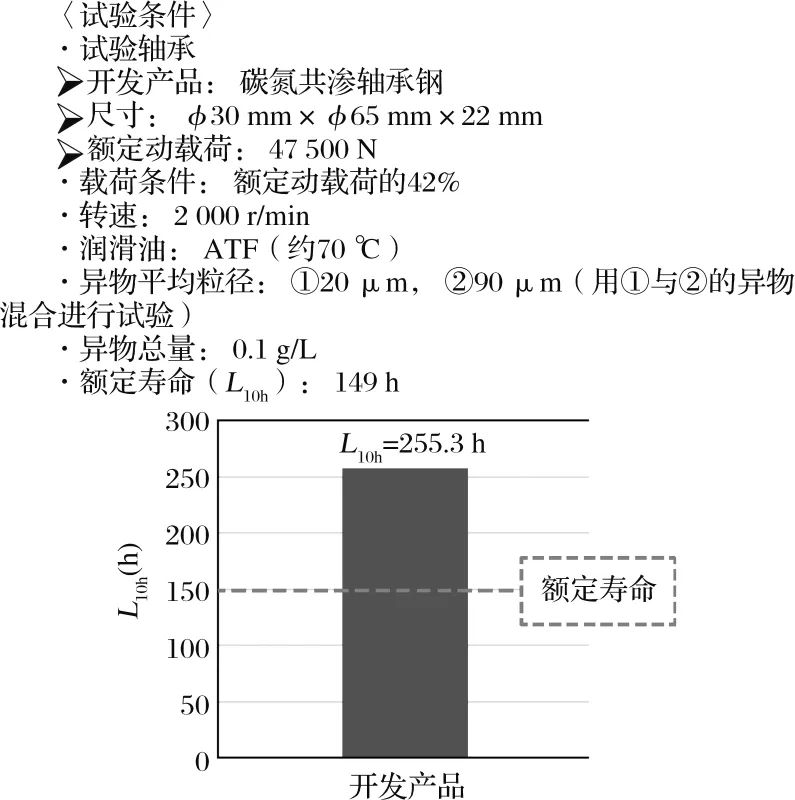 在混入硬质异物的润滑条件下对开发产品进行了使用寿命试验。如果在润滑油中混入硬质异物,则可能影响动力传动装置的使用寿命。虽然动力传动装置内的润滑油中混入的硬质异物有多种条件,但本试验评估了以下条件下的使用寿命。