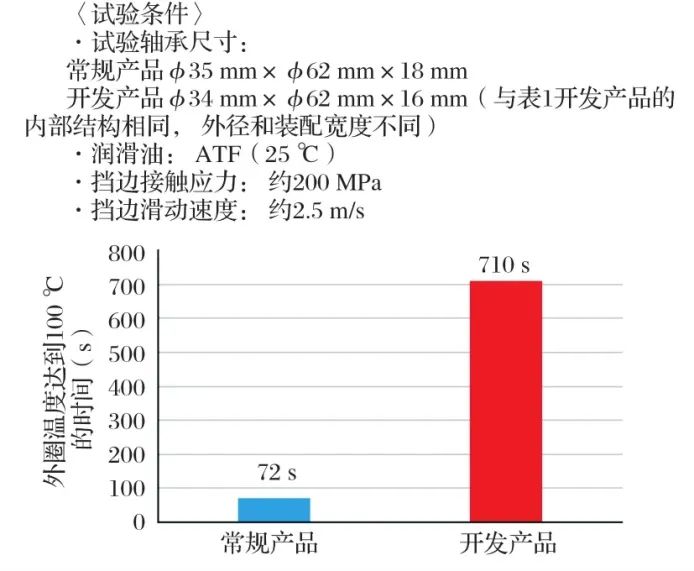 在下列条件下进行了评价试验,以确认开发产品的咬粘抗力。基于在动力传动装置中使用低黏度润滑油或模拟电动汽车快速加速的假设,在润滑油量较少的条件下进行了试验。在轴承上黏附微量润滑油,然后在室温下无供油运转,以试验轴承外圈温度达到100 ℃所需的时间。