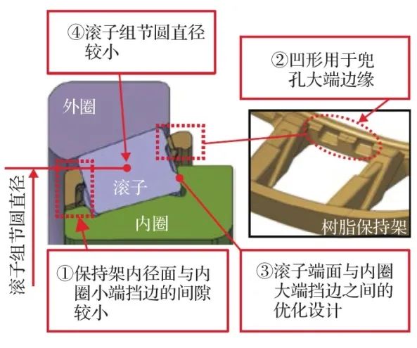 开发的低温升低转矩圆锥滚子轴承的结构如图1所示。图1所示的特点①—④对应于开发产品结构的以下说明。