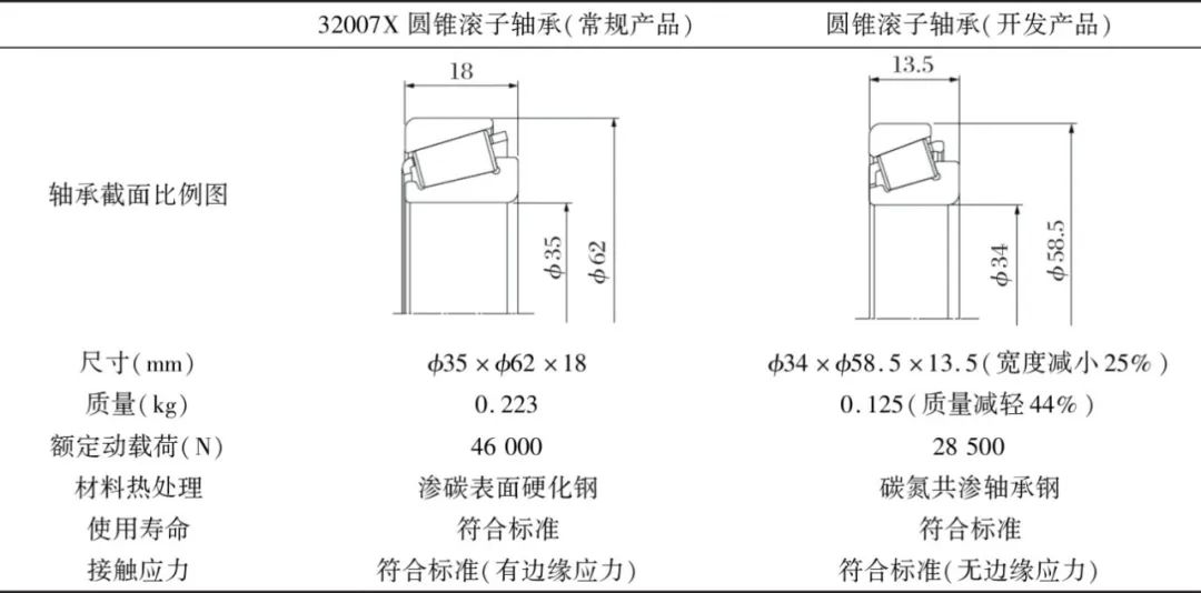 与常规圆锥滚子轴承(以下简称常规产品)相比,低温升低转矩圆锥滚子轴承(以下简称开发产品)的特点如下:
