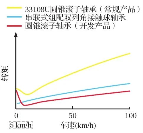 常规产品具有最高的转矩,而开发产品在车速为5 km/h时具有比球轴承更高的转矩,但在车速超过5 km/h时观察到的转矩比球轴承更低。