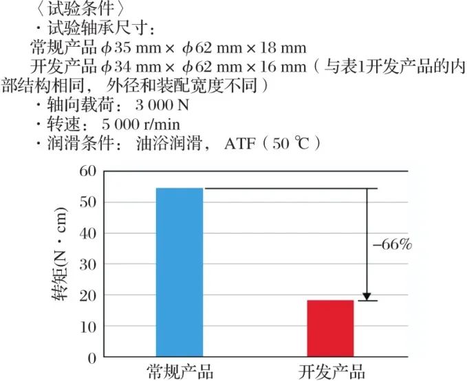 试验结果如图5所示。如前一节所述,由于润滑油的滚动摩擦和搅拌阻力较小,与常规产品相比,开发产品的转矩显著降低了66%。