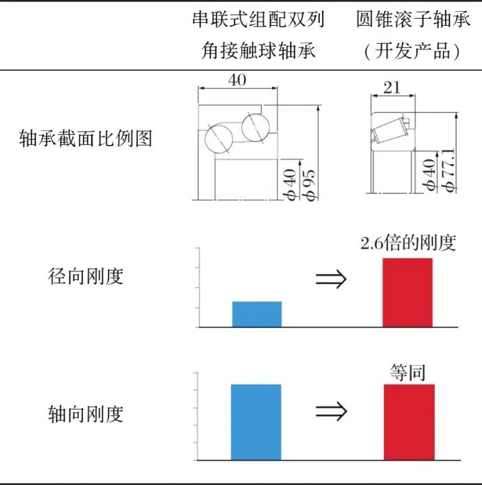 近年来在轴承选型阶段已出现了选用球轴承而不是圆锥滚子轴承以实现较低转矩的情况。考虑到这点,对开发产品与用于支承差速器小齿轮轴的串联式组配双列角接触球轴承(图8)进行了功能对比。