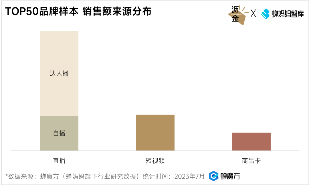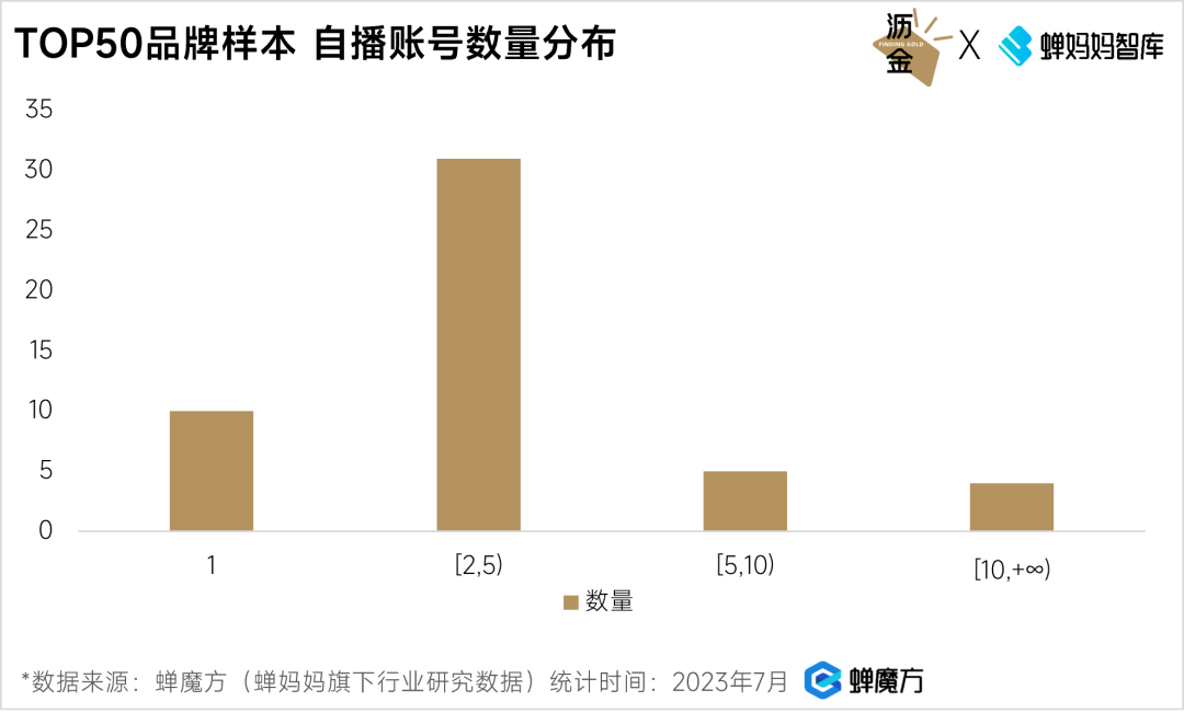 保健食品类目TOP50品牌的销售额来源多为达人播、自播;品牌普遍有多个自播账号,自播账号数在2-5个的品牌超30个。