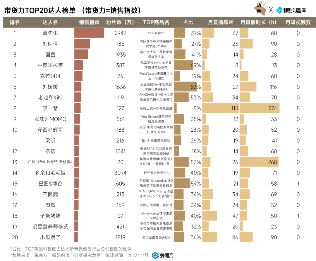 带货力TOP1的董先生是珠宝带货赛道的头部主播,粉丝基数大、购买力强;刘阿倩是姮好、简际品牌创始人 ,深耕疗肤及营养膳食赛道,粉丝画像与保健品消费群体吻合。