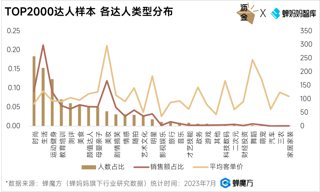 生活方式类达人规模大、销售额贡献最多;但美妆、舞蹈达人平均客单价高。