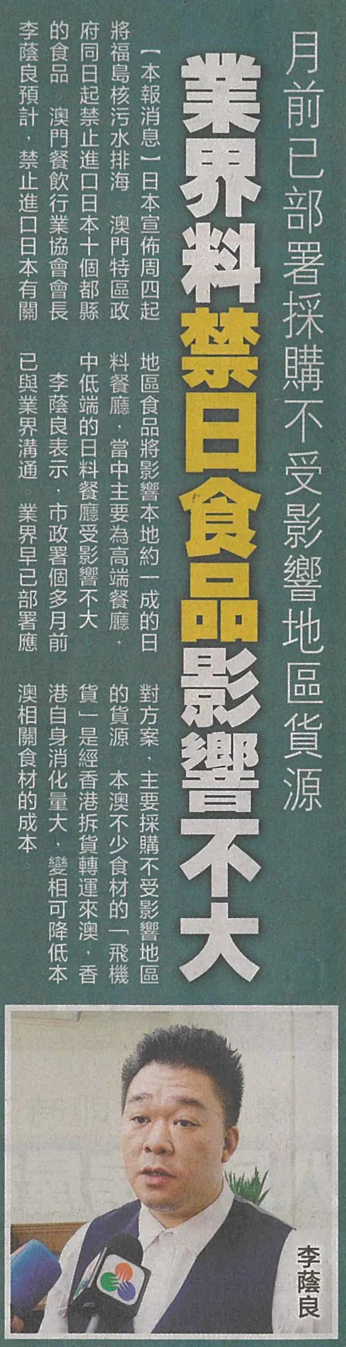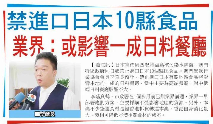 澳門經濟民生聯盟副理事長、澳門餐飲行業協會會長李蔭良預計,禁止進口日本有關地區食品將影響本地約一成的日料餐廳,當中主要為高端餐廳,中低端的日料餐廳受影響不大。