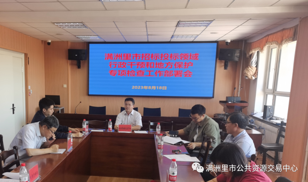 为贯彻落实呼伦贝尔市政务服务局印发的《2023年呼伦贝尔市招标投标领域行政干预和地方保护专项检查工作方案暨工程建设项目招标投标领域营商环境专项整治工作方案》精神,全面做好满洲里市优化营商环境招标投标指标问题整改和提升、创新工作,深入核查满洲里市招标投标领域内工程招投标方面存在的行政干预和地方保护等突出问题,努力营造公平公正公开和诚实守信的公共资源交易市场环境。近日,满洲里市公共资源交易中心召集满洲里市优化招标投标领域营商环境工作专班成员单位,主持召开了招标投标领域行政干预和地方保护专项检查整治部署会,会议传达了呼伦贝尔市招标投标领域行政干预和地方保护专项检查工作方案精神,明确了专项检查整治工作目标、检查范围和内容,要求各相关单位围绕招标前、招标活动中、招标活动结束后三个方面的20个具体问题认真组织开展自查整治工作。满洲里市行政审批和政务服务局、市住房和城乡建设局、市交通运输局、市农牧水利局、市自然资源局、市市场监督管理局等单位有关负责同志参会。