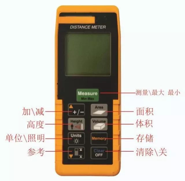 按“体积”键,显示体积符号;按“测量”键,测量第一个距离;按“测量”键,测量第二个距离;按“测量”键,测量第三个距离;该设备在总计行显示结果,并在第二行显示下一个测量值分别测量的距离。