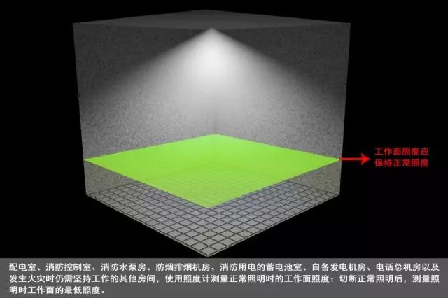 使用照度计测量应急照明灯地面中心最低照度不应低于0.5Lx,地下人防工程的照度不应低于5Lx,使用照度计测量消防控制室、消防水泵房、防烟排烟机房、消防用电的蓄电池室、自备发电机房、电话总机房等火灾发生时仍需坚持工作的房间正常照明时工作面的照度和应急照明时工作面的照度,如图3、图4所示。