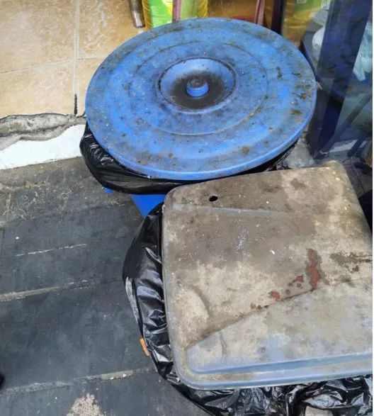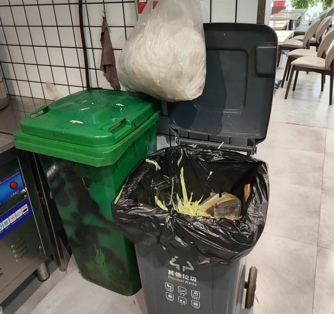 8月8日检查时,垃圾桶未加盖,地沟盖板缺损未修补,保洁柜未封闭苍蝇落在餐具上,冰箱未及时除霜,食材未使用保鲜膜(盒)摞放,消毒记录记录不规范。