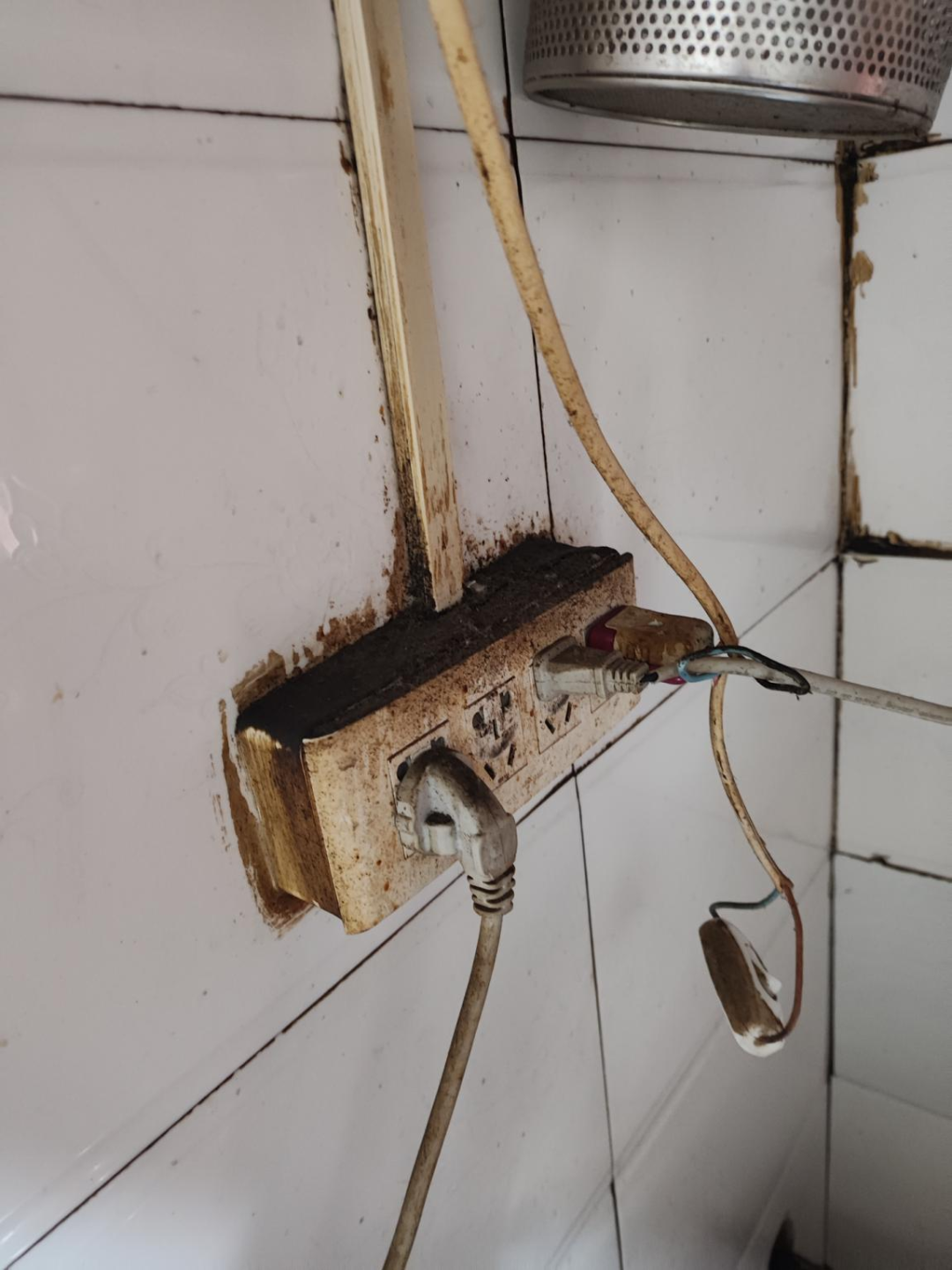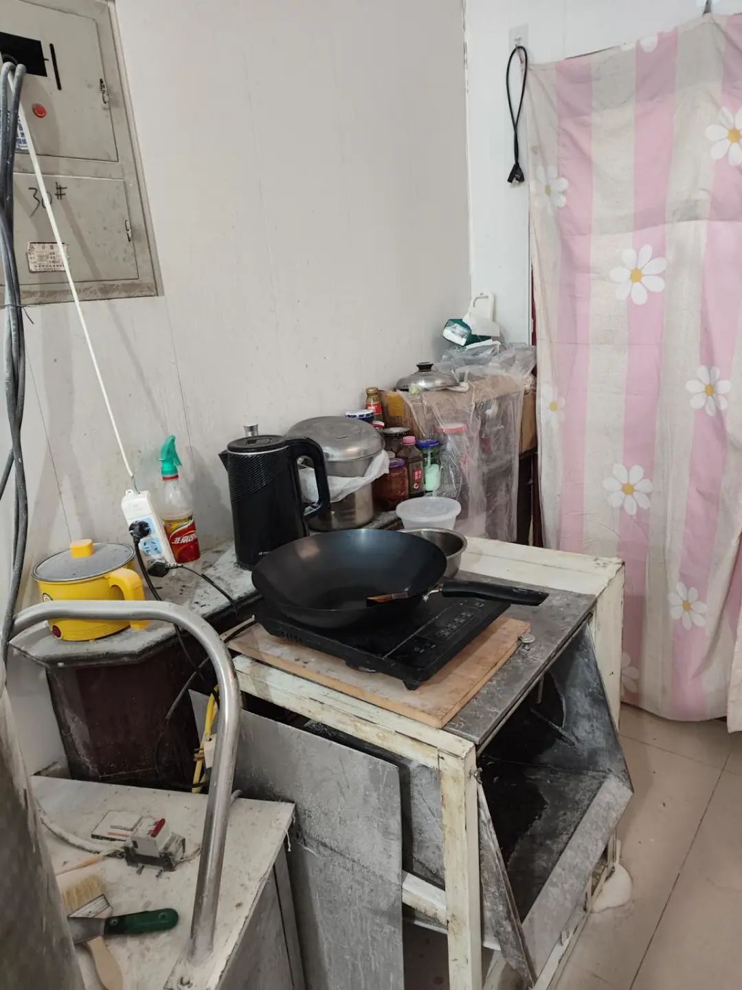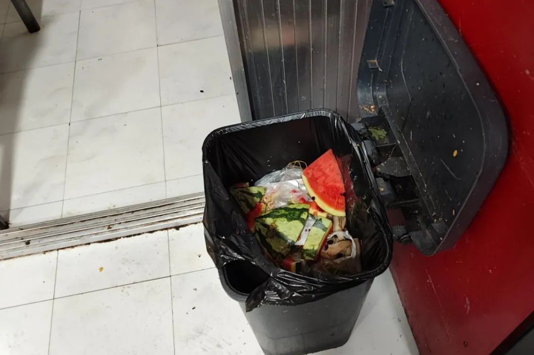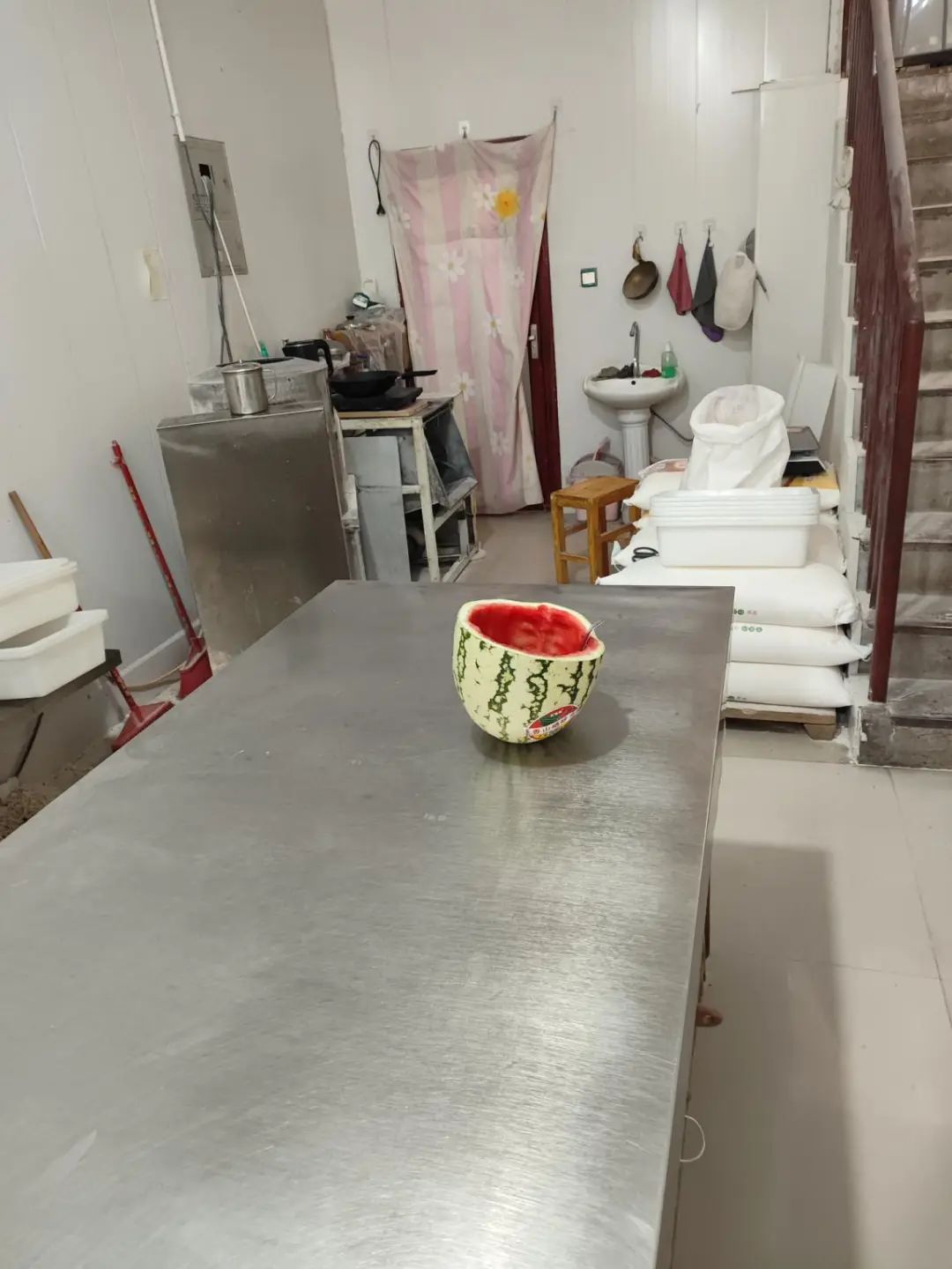 8月3日检查时,食用后的西瓜放置在台面上;面渣未及时清理;生活区未与加工区分开,电磁炉放置在备用和面机上。