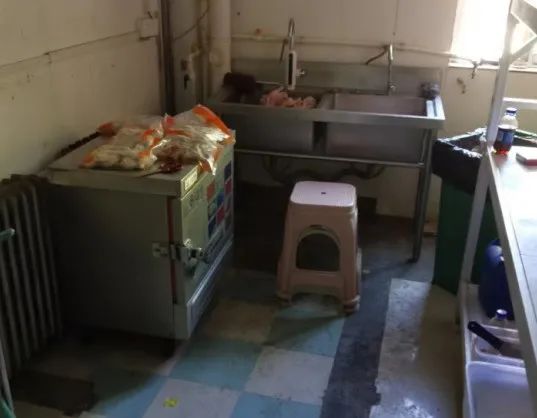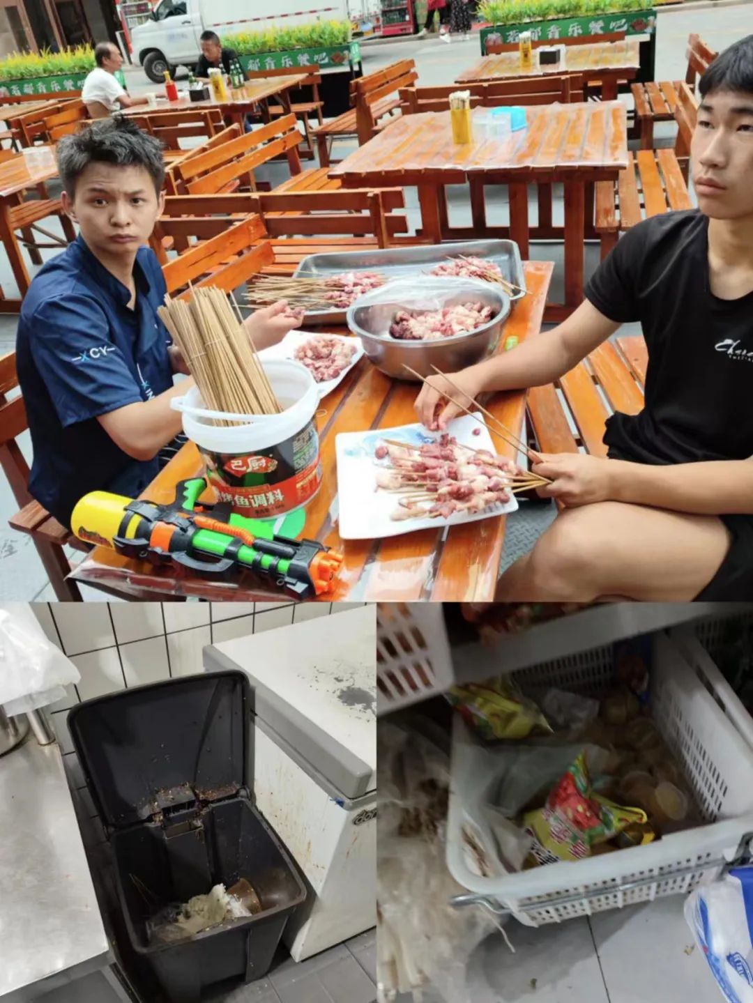 8月14日检查时,在室外串肉,冰箱内食材未使用保鲜膜包覆,使用非食品级容器浸泡食材,加工间面向街区大门未安装灭蝇灯和门帘。