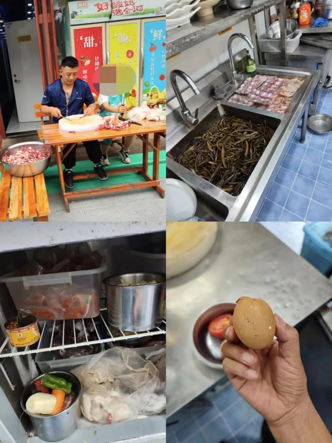8月14日检查时,室外串肉,水池直接浸泡食材,鸡蛋未清洗就蒸煮,冰箱内食材未使用保鲜膜包覆。