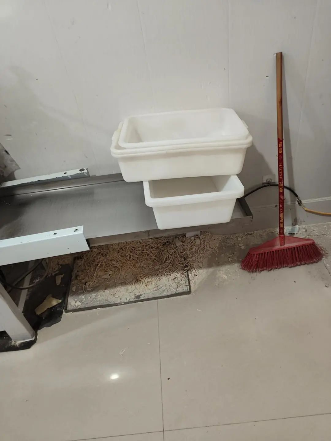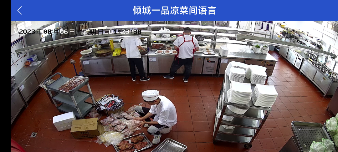 8月5日17:24通过“智慧食安”APP网络巡检时,发现工作人员席地为食材去除外包装(系统时间显示有误)。