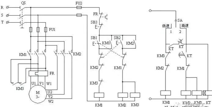 第二张图为:星三角启动,为控制大型设备启动电流压降影响,通过调压方式实现降压启动。设备刚启动时为星形启动,在延时继电器作用下实现三角形转换的一种控制方式。