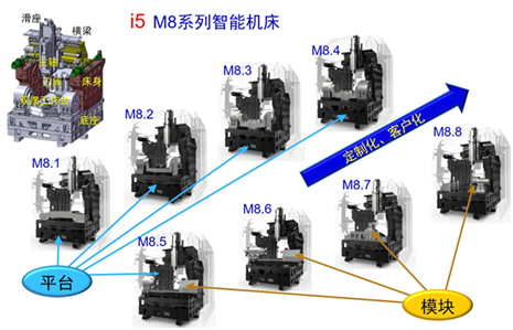 要实现上述目标,必须在产品设计上采取新思路、新方法和新技术。如何满足客户多样化的需求是一大挑战。i5智能机床采取平台化、模块化和客户化的战略,以实现基本运动的部件作为平台,配以模块化的功能部件,构成不同用途的机床。