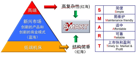 从图中可见,SMART的5个字母代表i5智能机床的5个重要特征:S(Simple)——简便,M(Maintenance friendly)——易维护,A(Affordable)——适中,R(Reliable)——可靠,T(Timely to Market & Profit)——上市快和盈利,并在SMART后面以红色斜体的“Y”表达沈阳机床对i5智能机床的愿景,是沈阳机床产品的开发理念和指导思想。