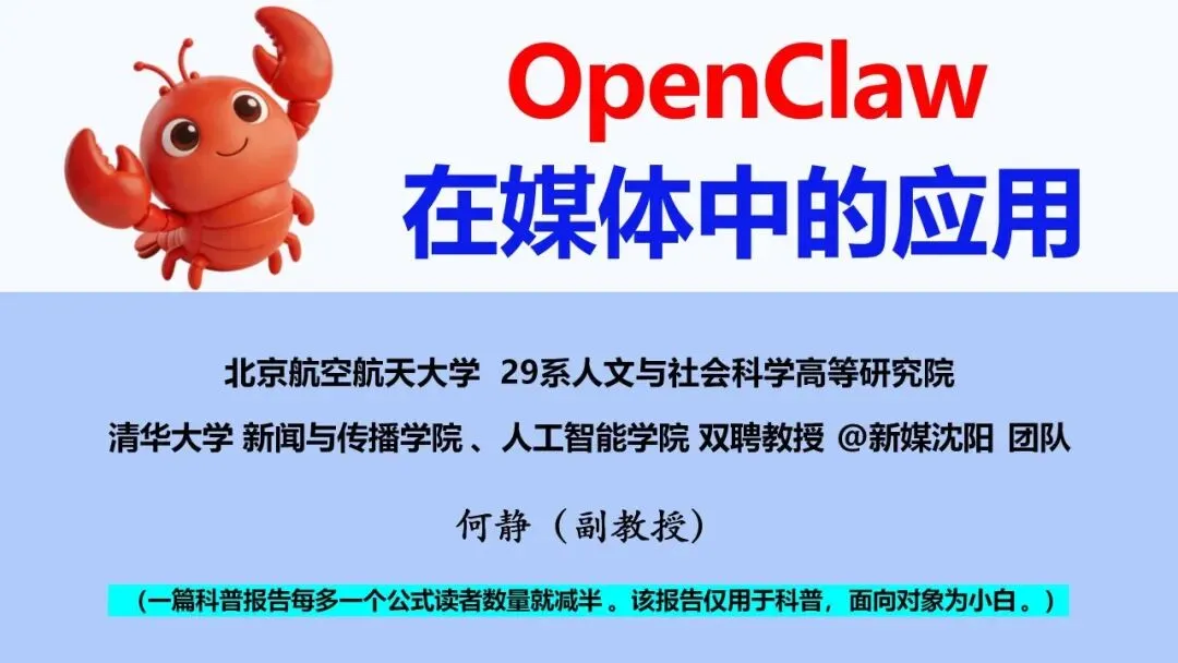 《OpenClaw在媒体中的应用》是清华大学和北京航空航天大学联合发布的科普报告。报告用33页的篇幅勾勒出OpenClaw正在如何改写媒体内容生产、传播与运营的全过程。《OpenClaw在媒体中的应用》这份报告,表面上是某个AI系统的功能展示,实则勾勒出媒体行业正在经历的工作流变革。 未来的媒体生产,不再是人在工具之间切换,而是智能体在流程之间协同。从热点追踪到选题生成,从文案创作到多端分发,从评论分析到粉丝增长,每一个环节都可以被智能体接管或增强。 但这并不意味着人的消失。当重复性、流程性的工作被智能体承担后,人的价值将更集中于判断、把关、创意与价值坚守。正如报告所言,AI赋能媒体的终点不是替代人,而是让人在更清晰的流程中、更精准的数据支持下,做出更优质的内容。 报告以一句温暖的话作结:“愿光明所及,皆是暖阳;愿人心所向,俱为温良。”在技术与人文的交汇处,这或许正是我们应当保有的姿态。公号后台回复“9”,在AI大模型·领地知识星球查看~如欲查看完整版文件,请扫描下方二维码加入“AI大模型·领地”获取。说明:本文部分文字与图片资源来自于网络,分享此文是出于传递更多信息之目的,若有来源标注错误或侵犯了您的合法权益,请立即后台留言通知我们,情况属实,我们会第一时间予以删除,并同时向您表示歉意。AI大模型·资料·藏经阁