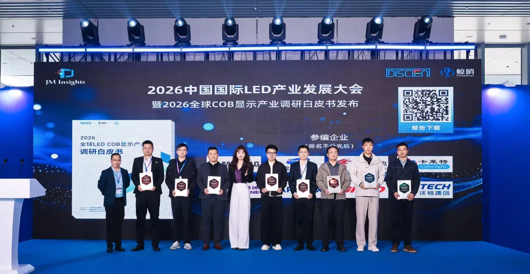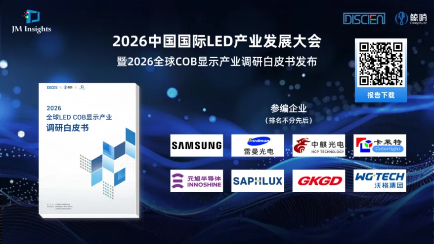 近日,DISCIEN(迪显咨询)联合 JM Insights (集摩咨询)、鲸哨 DeepBuzz重磅发布《2026 全球 LED COB 显示产业调研白皮书》,报告由雷曼光电、中麒光电、赛富乐斯、三星电子、山西高科、卡莱特、元旭半导体、沃格光电等行业领军企业联合参编,以全产业链深度调研、全维度精准数据,全面解码 LED COB 显示产业的全新格局,为行业把握新周期、抢抓新机遇提供核心参考与决策依据。
