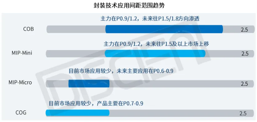 COB技术凭借成熟的工艺和“短产业链”优势,在P0.9/1.2等微间距市场构筑了显著成本优势,稳居中高端市场基本盘,并正向P1.5/1.8方向渗透。