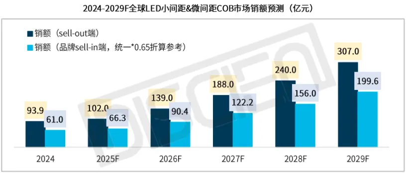 DISCIEN(迪显咨询)预测,未来五年 COB 市场将保持10% 以上的增速,稳居 LED 显示市场增长最快的细分赛道,预计到 2029 年,全球 COB 市场终端 Sell-out 端销售额将突破 307 亿元,在中国小间距 & 微间距市场的占比将超 60%,同时向 P1.5/1.8 及以上大间距市场全面渗透,持续抢占 SMD 技术的市场份额。