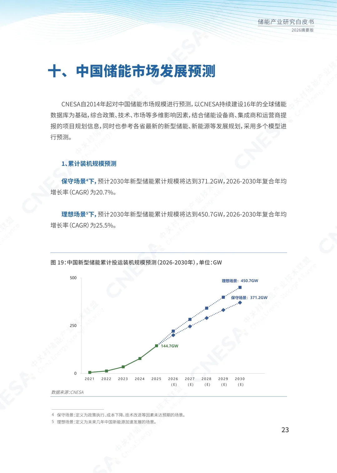 此次发布的白皮书中,CNESA结合保守场景1与理想场景2,对 2026-2030 年中国新型储能市场规模的预测如下: