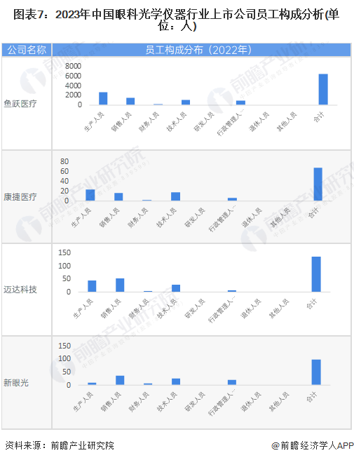 从眼科光学仪器行业的上市企业已有的公开信息分析,员工总数最多的企业是鱼跃医疗,员工总数为6362人;技术人员相对最多的是鱼跃医疗,技术人员总数为1137人;其余三家专门从事眼科光学仪器相关业务生产的企业人员规模总体较小。