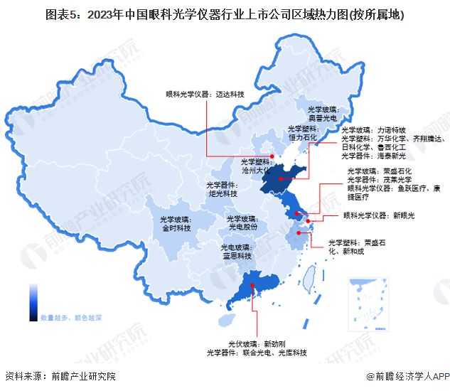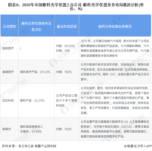 眼科光学仪器行业的上市公司中,不同公司业务区域布局存在较大差异,其中迈达科技公司产品出口国际六十多个国家和地区,其他企业则业务高度集中于国内市场。