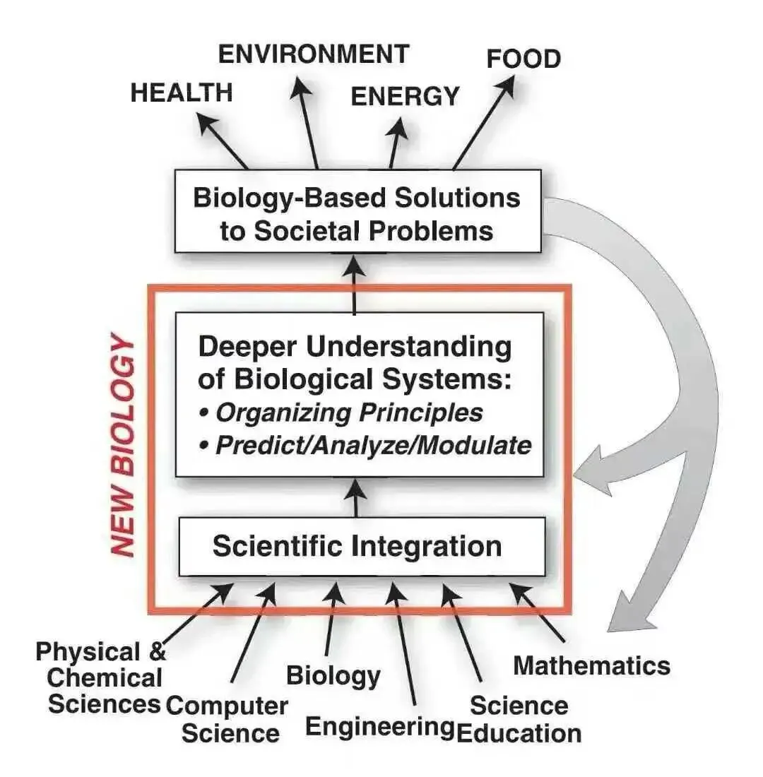 2009年,美国国家科学院发布《21世纪的新生物学:确保美国引领即将到来的生物学革命》报告,旨在回应生物学领域的范式转变。报告指出,生物学正从分散的、还原论的研究转向整合的、系统性的“新生物学”(New Biology),其核心是通过跨学科融合(整合生物学子领域、物理、计算、工程和数学)来解决社会重大挑战。这一愿景的提出,源于当时生物学领域的三大趋势: