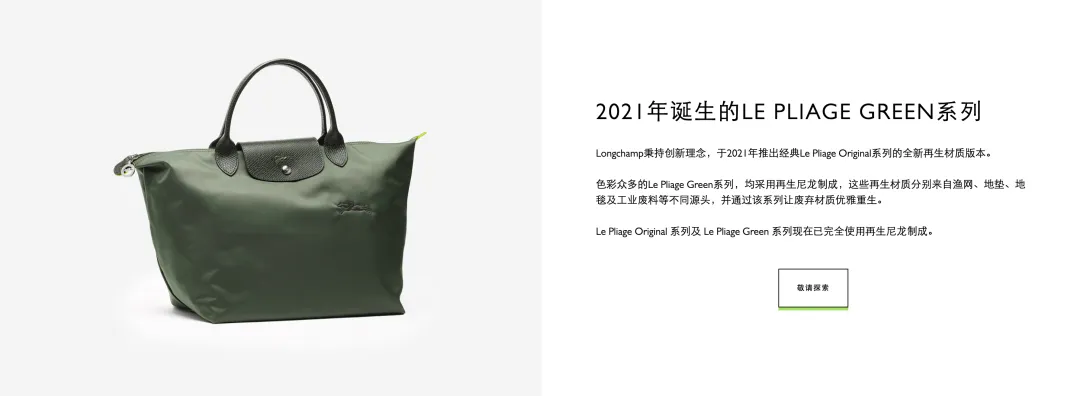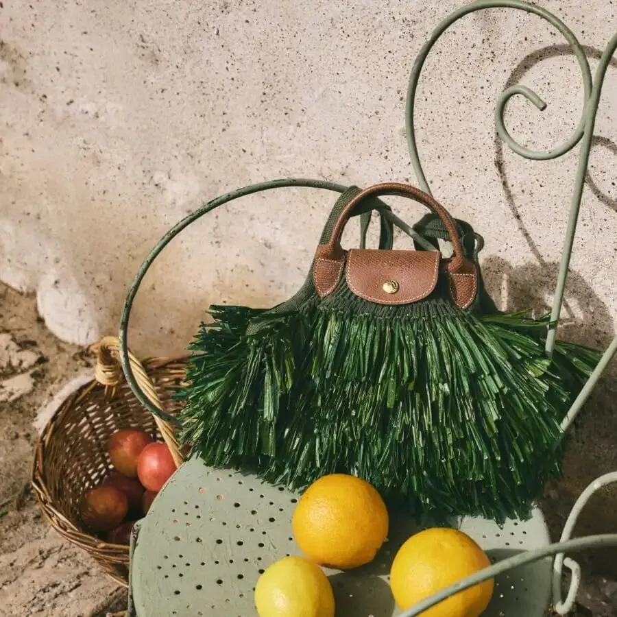 在此基础上,Longchamp 于 2021 年推出了 Le Pliage Green 系列,将再生材质引入这一经典设计之中。该系列所使用的再生尼龙来源于渔网、地毯及工业废料等回收材料,在延续原有使用体验的同时,也让材料本身进入新的循环路径。随着这一系列的推出,Le Pliage 在保持耐用与可修复特性的同时,也进一步回应了品牌在材料层面的可持续实践。