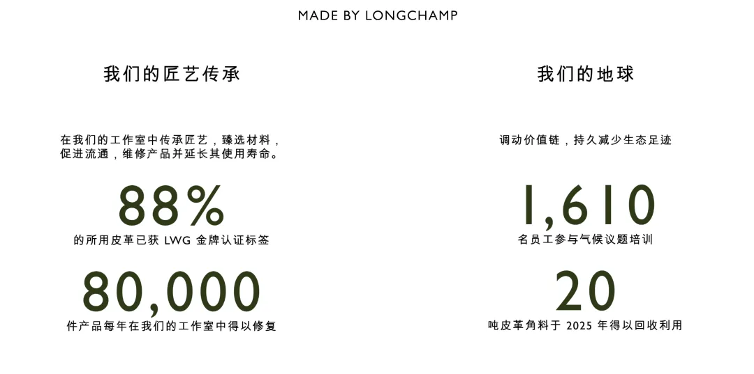 产品的耐用性与可修复性,不仅取决于设计本身,还与材料选择、生产方式和供应链管理密切相关。对 Longchamp 来说,可持续贯穿在从原料到生产的各个环节之中。