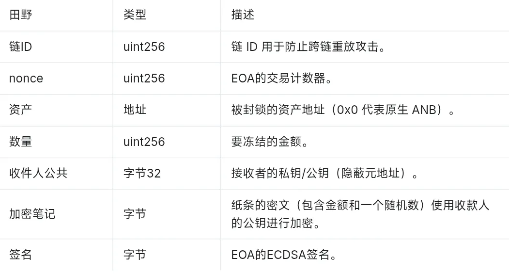 为了原生支持与 EVM 兼容的链上的隐私操作,Anubis 采用了 EIP-2718 类型的交易信封标准。与 EIP-1559(类型 2)等标准交易不同,Anubis 定义了自己的交易类型范围 0x64 到 0x67(十进制 100-103),用于承载隐私相关的元数据,例如零知识证明、空运算符和承诺。